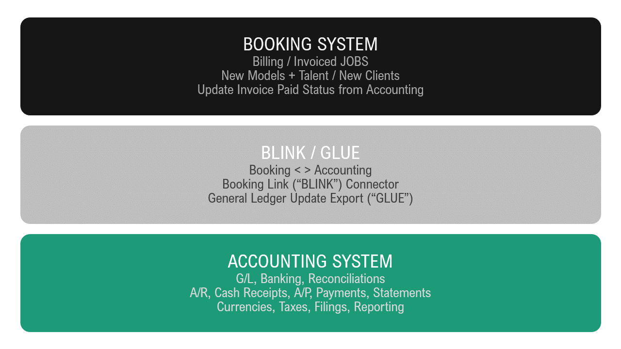 The BLINK and ABLE move jobs, usages, expenses, and invoices from booking into agency accounting for cash receipts, collections, reconciliations, and model statements, etc. Our General Ledger Update-Export aka “GLUE” integration is part of both platforms, linking agency accounting to your localized accounting system. GLUE binds sub-ledger accounting to banking and financial data within the agency’s country-specific general ledger and accounting system.